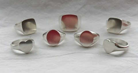 At madeinhearts.co.uk I have a wide range of shapes and sizes of handmade sterling silver signet rings for you to choose from, cast to order in your specified shape, head size and finger size, then engraved in house ( or garden workshop ) ready to dispatch in on average three ( 3 ) working days. INTRODUCTORY OFFER , all this from just £75.00